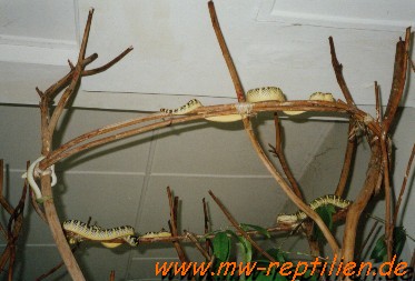 Lanzenotter (Trimeresurus wagleri) in einem Schlangentempel auf Penang.